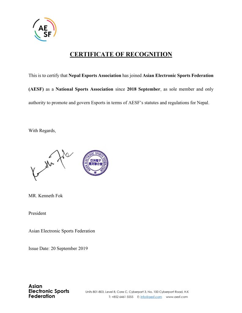 A lot of credit goes to the President of the Nepal Olympic Committee, Mr. Jeevan Ram Shrestha. His unwavering cooperation has been instrumental in establishing NESA as the official governing body for esports activities in Nepal. Recognition from the Nepal Olympic Committee has not only boosted our confidence with the government but also facilitated our international affiliations.